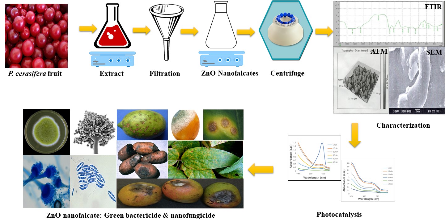 Zinc oxide nano falcates of sickle shape have been synthesized from Prunus cerasifera pomological extract as a reducing cum stabilizing agent via novel, biomimetic and non-toxic route. Zinc oxide nano falcates were analyzed via ultraviolet spectroscopy, Fourier transform infrared analysis, X-ray powder diffraction, scanning electron microscopy and atomic force microscopy. Highly stable zinc oxide nano falcates synthesized at 200°C and 400°C calcination temperatures expressed intense UV-vis peak at 398 nm. Phenolic and amino groups were revealed by FTIR in pomological extract. Wurtzite crystalline structure of zinc oxide nano falcates was confirmed by XRD with average crystal size of 4.93 nm. SEM sizes ranged between 72.11-120 nm and 56.57-107.70 nm, respectively and shown higher polydispersity levels for two calcination temperatures. Augmented photocatalytic degradation of methyl red and bromophenol blue under direct solar irradiance shown pseudo first order kinetics (R2= 0.99 and 0.96). Furthermore, biomedical and agriculturally important pathogenic strains i.e., Xanthomanas axonopodis pv. citri and Pseudomonas syringae, Aspergillus niger, Aspergillus flavus, Aspergillus fumigatus, Aspergillus terreus, Penicillium chrysogenum, Fusarium solani and Lasiodiplodia theobromae were remarkably inhibited. Enhanced photocatalytic and antimicrobial activity reveals zinc oxide nano falcates promising prospects in nano bioremediation of polluted water and conversion into green nano pesticides.