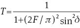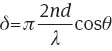 Here, F is the finesse and δ is essentially the order of the etalon, which depends upon the ratio between the optical thickness nd and the wavelength λ, modified by the angle of refraction inside the etalon θ when the etalon is tilted. When δ takes integer multiples of π, sin δ=0, and peaks in transmission occur.