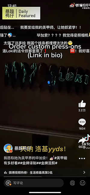 In the video clip, a manicurist feels so satisfied with her nail work with a hand drawing of the film role Loki on it that she says excitedly, “Oh my god, I’m obsessed!”. In the blogger subtitled version, this pleasant surprise is transferred with the use of a Chinese network buzzword “yyds”, the pinyin abbreviation of “永远的神” (yongyuan de shen), literally meaning “eternal God”. Originated from a compliment for an eSports player, this word has swept China’s cyberspace and ranked top 10 expressions on the Internet in 2021, used to show his/her feeling when one finds someone or something extraordinary, godlike and exceptional (China Daily 2021). Within a digital interaction context, “yyds” has its meaning discursively constructed, indexical of the online popular culture. For the blogger subtitler, social media platform opens a door for her to not only computer-born sociocultural variables but also creative discursive practices, which are identified as she transfers the localized usage of “yyds” to her onscreen interlingual engagement, whereby imbuing it with new expressive function.