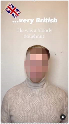 00:05 Ah, he was a bloody doughnut! …very British (preceded by a British flag sticker)