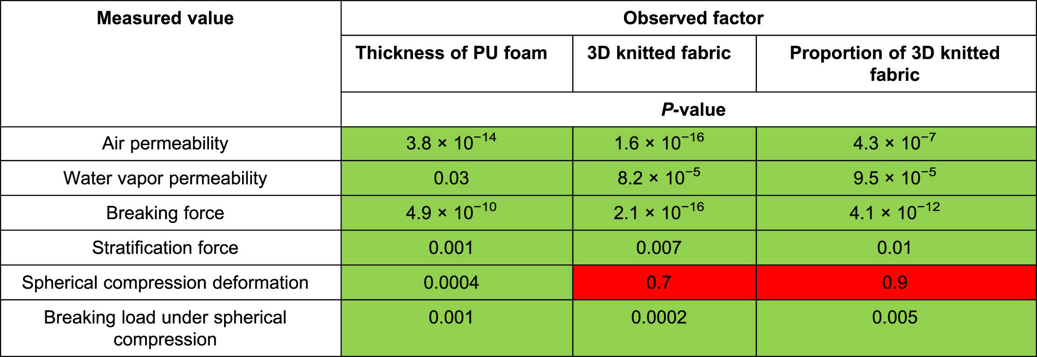 A one-way ANOVA was performed to determine the significance of the spacer fabric added to the PU foam in the laminate for the permeability properties (air permeability, water vapor permeability) and the mechanical properties (breaking force and elongation, strength under load with a ball, stratification force).