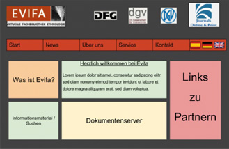 Der Designentwurf ist mittlerweile fertiggestellt und muss nun nach und nach auf die in Plone erstellten Seiten übertragen werden; dies soll von November 2017 bis Januar 2018 geschehen. Durch die Einbindung anderer Oberflächen (PRIMO, Goobi Presentations für die Digitalisate, KfL-ERMS für den Zugang zu den Lizenzen) wird es leider nicht möglich sein, alles völlig gleich gestalten zu können. Zum Teil werden wir über das Farbschema und das EVIFA-Logo? Zugehörigkeiten deutlich machen müssen. Im Zuge dieses Anpassungsprozesses wird gleichzeitig die Struktur des Fachportals einer Revision unterzogen und Inhalte werden gebündelt oder – wie z. B. der Zeitschrifteninhaltsdienst oder LOTSE – gestrichen, einige andere hingegen ganz neu erstellt werden (FID-Lizenzen). Mit dem wissenschaftlichen Beirat des FID, der schon zu SSG-Zeiten die Arbeit und das Portal begleitete und sich aus Vertreterinnen und Vertretern beider ethnologischen Fachtraditionen in verschiedenen Bereichen (Fachgesellschaften, Universitäten, außeruniversitäre Forschung und Museen) zusammensetzt, und mit bibliothekarischen Kolleginnen und Kollegen wurden diese Strukturentscheidungen in Sitzungen und bei Fortbildungen im Herbst 2017 diskutiert und auf den Prüfstand gestellt.