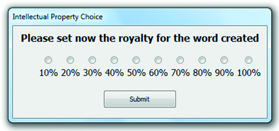After producing a word, you have to decide whether or not to set a royalty fee that other players are required to pay when creating extensions. If you set a royalty fee, you will have to choose between 10 and 100 % of the value of the word.