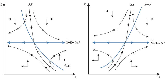 The transitional dynamics of the system can be expressed by means of a phase diagram. It is clear from (13)–(15), that the slopes of loci