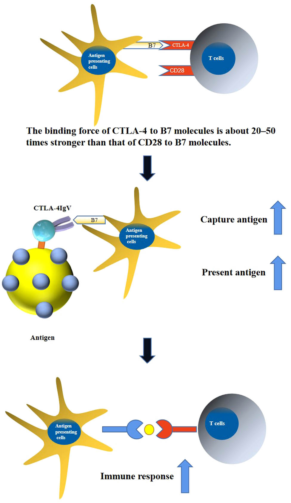 CTLA-4, a member of the B7/CD28 family that was first discovered by Brunet et al. [2], is a unique receptor on the surface of cytotoxic T lymphocytes. CTLA-4 shares structural similarities with CD28 [7] with 70% homology at the DNA level and 31% homology at the amino acid level. Both proteins are transmembrane receptors expressed on the surface of T cells, and they are collectively called the CD28 family of molecules [8]. B7 is an important costimulatory molecule that mediates T-cell activation. CD28 and CTLA-4 competitively bind to the common ligand B7, which inhibits T-cell proliferation and exerts a negative immunoregulatory effect [9]. T Cells are regulated to maintain the body’s immune tolerance [10]. However, the extracellular region of CTLA-4 alone lacks a transmembrane region and an intracellular region; the immune signal cannot be transmitted into the cell [11,12]. Thus, CTLA-4 does not have a negative regulatory effect. The binding force of CTLA-4 to B7 molecules is about 20–50 times stronger than that of CD28 to B7 molecules. Using this feature of CTLA-4 IgV can target and guide antigen presentation to APC cells.
