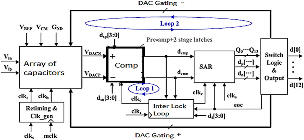 The BCI and illness diagnosis might both gain from this development. Modern EEG and machine learning can automatically assess data, leading to more accurate illness detection. Recently, the advancement of the analogue world with digitisation exhibits technological advancement with the implementation of the Internet of Things, big data, and cloud [1]. The data acquisition device incorporates an analog-to-digital converter (ADC) to increase the big data accuracy. The advancement in the design of ADC focused on precision digital designing throughout the applications [2,3,4,5,6]. Through historical metrology, the speed and resolution are increased within the ADC devices [7]. Different applications require high performance to achieve desired ADC in different areas [8]. Examples of ADC are program controllers, process control, control of the electric motor, and electrical energy distribution. With minimal instrumentation, domain testing, development, research, and qualification are adopted to achieve higher precision in the conversion of digital transformation [9]. At present, a vast range of ADC architectures are implemented to increase the precision aligned with the principle of ADC. The example of those is successive approximation register (SAR). The design of SAR comprises 24 bits resolution with minimal MSPS and 32 bits of several hundred Kbps [10]. Conventionally, the ADC belongs to the class of analogue signals provided with a fixed frequency range [11].