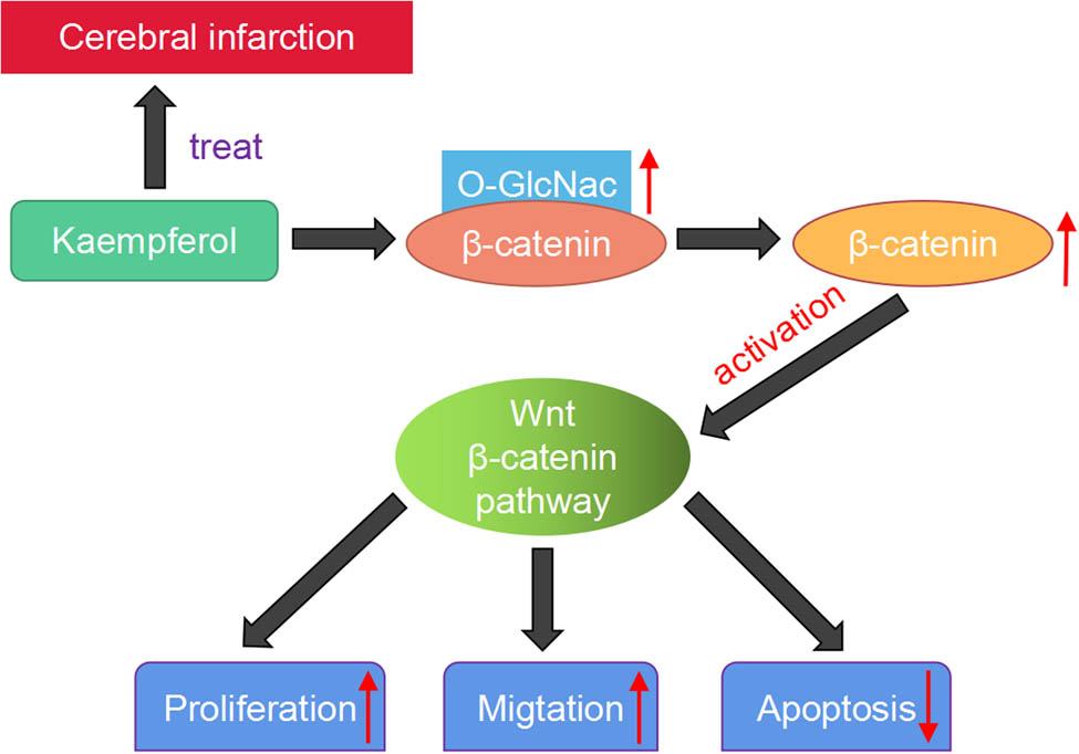In conclusion, Kae promoted the viability, and migration, and inhibited apoptosis of NSCs by activating the Wnt/β-catenin pathway mediated by O‐GlcNAcylation of β-catenin, thereby attenuating cerebral infarction and neurological injury. The findings provided a theoretical basis for Kae to be used as an effective drug for ischemic stroke therapy.