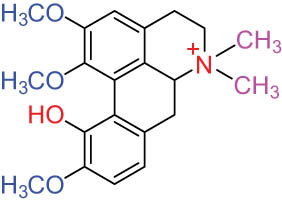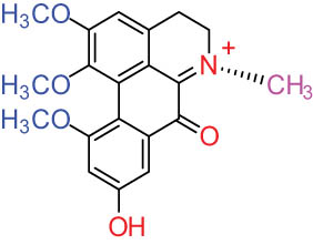 Magnoflorine (MAG) | C20H24NO4 + | 342.5 | Whole plant [1,5]; roots [8,8] | |