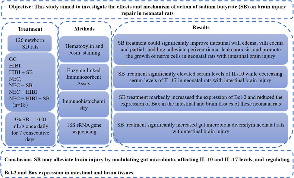 In conclusion, SB, a metabolite of the intestinal flora, may alleviate brain injury in neonatal rats by modulating the structure of the gut microbiota, affecting the levels of the inflammatory factors IL-10 and IL-17, modulating the expression of Bcl-2 and Bax in intestinal and brain tissues, and reducing neuronal cell apoptosis. This study confirmed that intestinal inflammation plays a role in the onset and progression of brain injury in neonatal rats, thereby furnishing a robust theoretical foundation for the therapeutic use of SB in addressing brain injury.