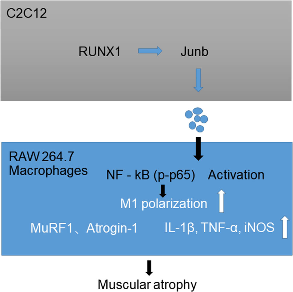 Critically, our study bridges RUNX1 to the JUNB-NF-κB axis, revealing its dual impact on immune and muscle cells. RUNX1 overexpression in myotubes not only upregulated JUNB but also induced a paracrine inflammatory cascade that polarized macrophages toward M1, further amplifying muscle atrophy markers. This crosstalk highlights the microenvironmental interplay between myocytes and macrophages in driving atrophy. The reversal of these effects by JUNB knockdown confirms its centrality in RUNX1-mediated pathology. Notably, myeloid-specific JUNB deletion in cerebral malaria models reduces IL-1β/TNF production and shifts macrophages toward a regulated phenotype, improving survival [18], a finding that dovetails with our observation that JUNB silencing suppresses M1 polarization and NF-κB activation. Collectively, these data position JUNB as a linchpin connecting transcriptional regulation (via RUNX1) to inflammatory signaling (via NF-κB) in muscle atrophy. A limitation of our study is the use of the immortalized RAW 264.7 macrophage cell line, which may amplify RUNX1-induced signaling and does not fully replicate the complex interactions between macrophages, satellite cells, and fibroblasts in muscle. Future studies should isolate primary macrophages from denervated muscles and employ co-culture systems to validate our findings and further elucidate the physiological relevance.