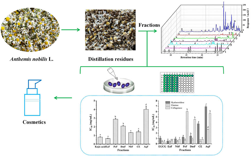 The flower parts of the Roman chamomile plant were produced in the Jiamusi region 46°48′35″N of latitude and 130°22′08″E of longitude (Heilongjiang Province, China) and picked. Plant material was identified by Dr. Zhong Wang of the Department of Intelligent Agriculture, College of Biology and Agriculture, Jiamusi University, Heilongjiang, China. The melanoma (B16F10) cells were purchased from the Cell Bank of the Chinese Academy of Sciences (Shanghai, China). 1,2-Diphenyl-2-picrylhydrazyl (DPPH) was purchased from MacLin Biochemical Technology Co., Ltd (Shanghai, China). Butylhydroxytoluene (BHT), epigallocatechin gallate (EGCG), N-[3-(2-furyl) acryloyl]-leucine glycine proline alanine (FALGPA), hyaluronic acid, hyaluronidase, elastase, and collagenase were purchased from Sigma Aldrich Trading Co., Ltd (Shanghai, China). All other chemical reagents were of analytical grade or above.