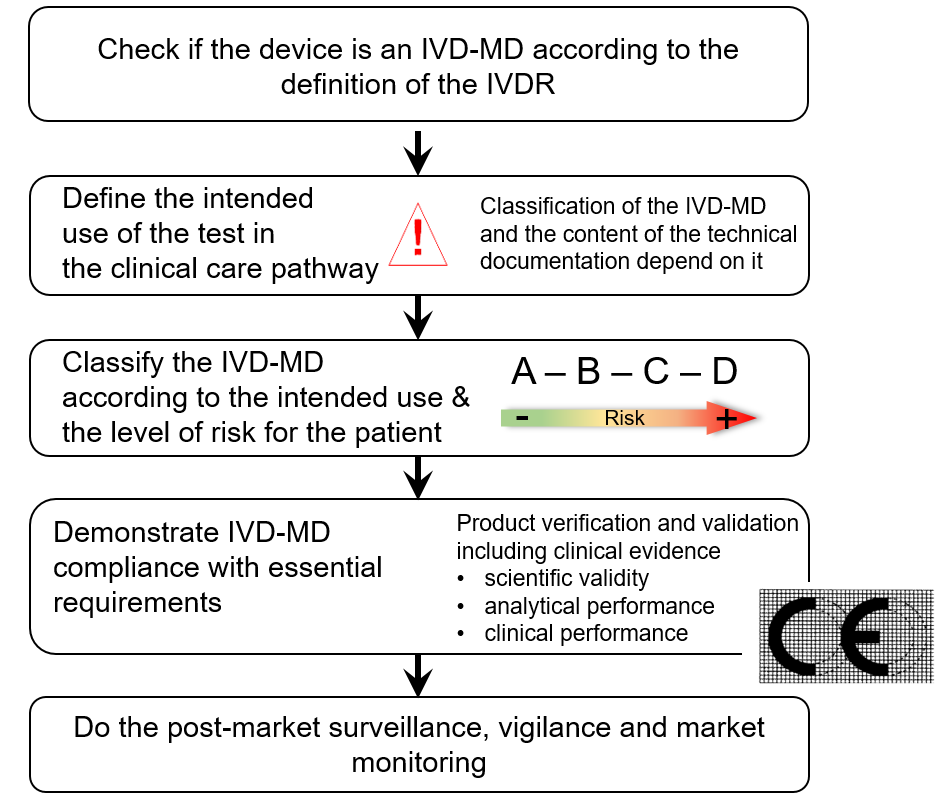 Once the IVD-MD status is identified, the intended use of the IVD-MD must be precisely and carefully defined. The compliance with the essential requirements must then be demonstrated, including performance evaluation for the expected intended use of the IVD-MD. CE mark can be obtained only if all conditions of performance and safety are met. It must be maintained by carrying out post-market surveillance and vigilance.