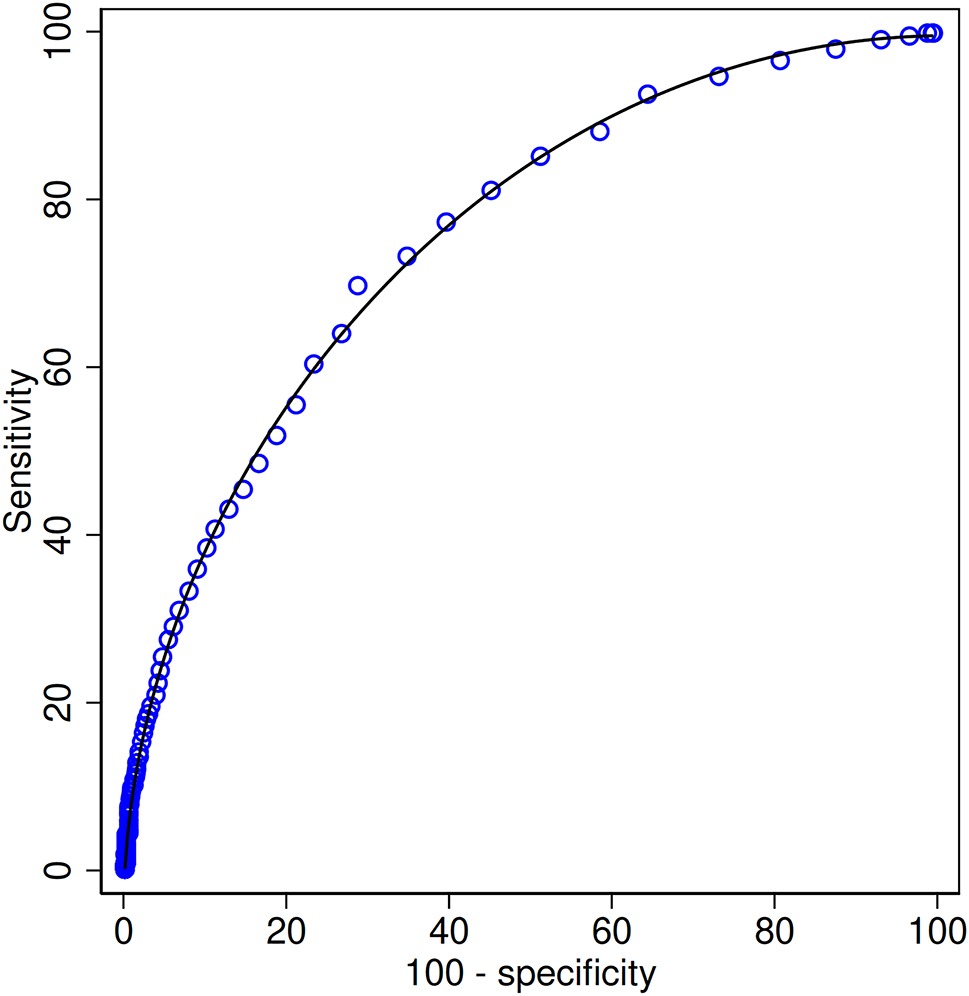 LR of a certain FIB-4-value is the slope of the tangent of the ROC-curve at the point of the curve that corresponds to the FIB-4-value [5]. Using the online software tool WebPlotDigitizer (https://apps.automeris.io/wpd/), we read the values of sensitivity and specificity from Figure 2B in [1] and constructed the ROC curve (data in the supplementary file). As a check of the reading accuracy we calculated the area under the plot of sensitivity vs. 100 – specificity, from a value of 0.18 to 99.52 % for 100 – specificity (the lowest and highest values we were able to read). The area was 0.752, quite close to the value 0.76 given in the article of Mózes et al. [1]. Then we used fractional polynomial regression (mfp-module in Stata, version 16) to smooth the curve. The function of the smoothed ROC curve was y=23.82 + 44.05 × ((x/10)0.5 − 0.6723) − 0.3405 × ((x/10)2 – 0.2043), where y is sensitivity and x is 100 – specificity (Supplementary Figure). Finally, we found the derivative of the smoothed ROC curve using an on-line service from WolframAlpha (https://www.wolframalpha.com/). This gave us an expression of LR as a function of 100 – specificity: LR=6.965/x0.5 – 0.006812 × x, where x is 100 – specificity (in percent). From Figure 2B in [1] we know the connection between FIB-4-values and 100 – specificity, so we were able to construct a curve (Figure 1A) showing the LR of FIB-4-values up to 5. Very few patients have higher values. Knowing the LR of FIB-4-values, we calculated the posttest probability for advanced liver fibrosis for FIB-4-values up to 5, given four different values of pretest probability (Figure 1B). A more accurate function of LR might possibly be derived directly from the collection of individual data [2]. However, we believe that our figures are sufficiently accurate for the purpose and hope they will be clinically useful, in spite of the difficulties judging pretest probability. For instance, as shown in Figure 1B, in a patient with FIB-4 of 1.3 (corresponding to a LR of about 1), posttest probability is almost the same as the pretest probability. Then, if the pretest probability is 5 %, the posttest probability is also 5 % and perhaps below the threshold for referral to more definitive diagnostic procedures. If the pretest probability is 20 %, the conclusion may be quite the opposite at the same value of FIB-4, illustrating the need for individual assessment.