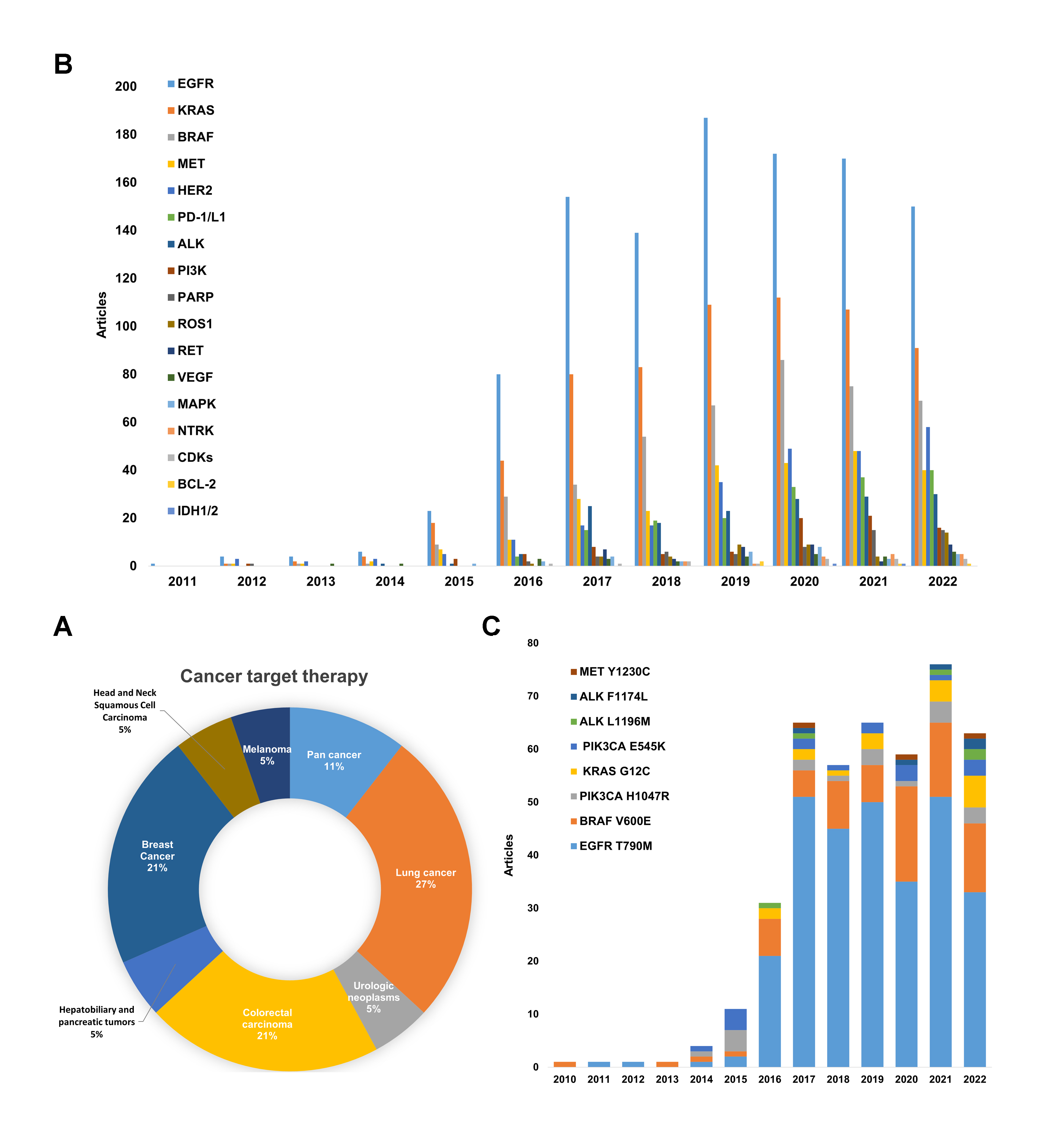 We reviewed prior studies to grasp trends in ctDNA and targeted therapy research. Five chief tumor mutation targets in ctDNA emerged: EGFR, KRAS, BRAF, MET, and Her2, with applications spanning clinical practice [54, 55]. EGFR and ctDNA research began earliest, peaking in 2019, while Her2 and ctDNA studies have risen consistently, signaling its rising prominence (Supplementary Figure 1B).