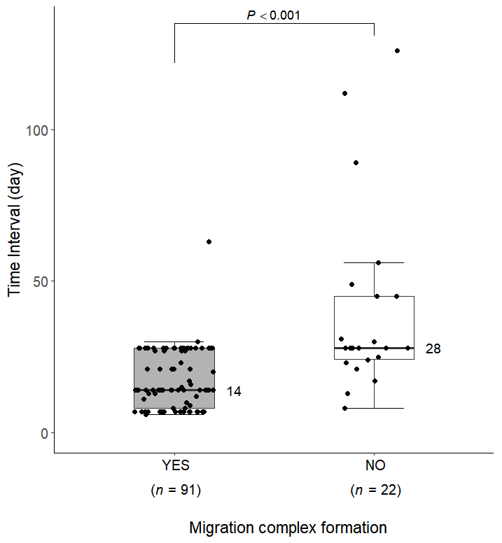 Out of the 113 samples, 22 exhibited no visible migration complex. This absence could be attributed to low serum daratumumab concentrations, falling below the limit of visualization. Caillon et al. demonstrated that migration complexes become difficult to visualize when daratumumab concentration drops below 0.2 g/L [12]. Daratumumab pharmacokinetic data indicate that serum concentrations may dip below 0.2 g/L after reaching steady state [15]. However, the high variability in serum daratumumab concentrations among patients made it impossible to precisely estimate the concentration. Therefore, our analysis concentrated on factors influencing serum daratumumab concentration: the daratumumab infusion cycle, dosage, and sampling timing. Firstly, the number of daratumumab infusion cycles was sufficient to assume a steady state in all samples. Secondly, the daratumumab dosage was consistently set at 16 mg/kg for all patients. Thirdly, the interval between serum sampling and daratumumab infusion was significantly longer in the group without the migration complex (n=22) compared to the group with the migration complex (n=91), as shown in Supplementary Figure 1. We hypothesize that this extended interval led to the relatively lower serum daratumumab concentrations, resulting in the absence of a visible migration complex.