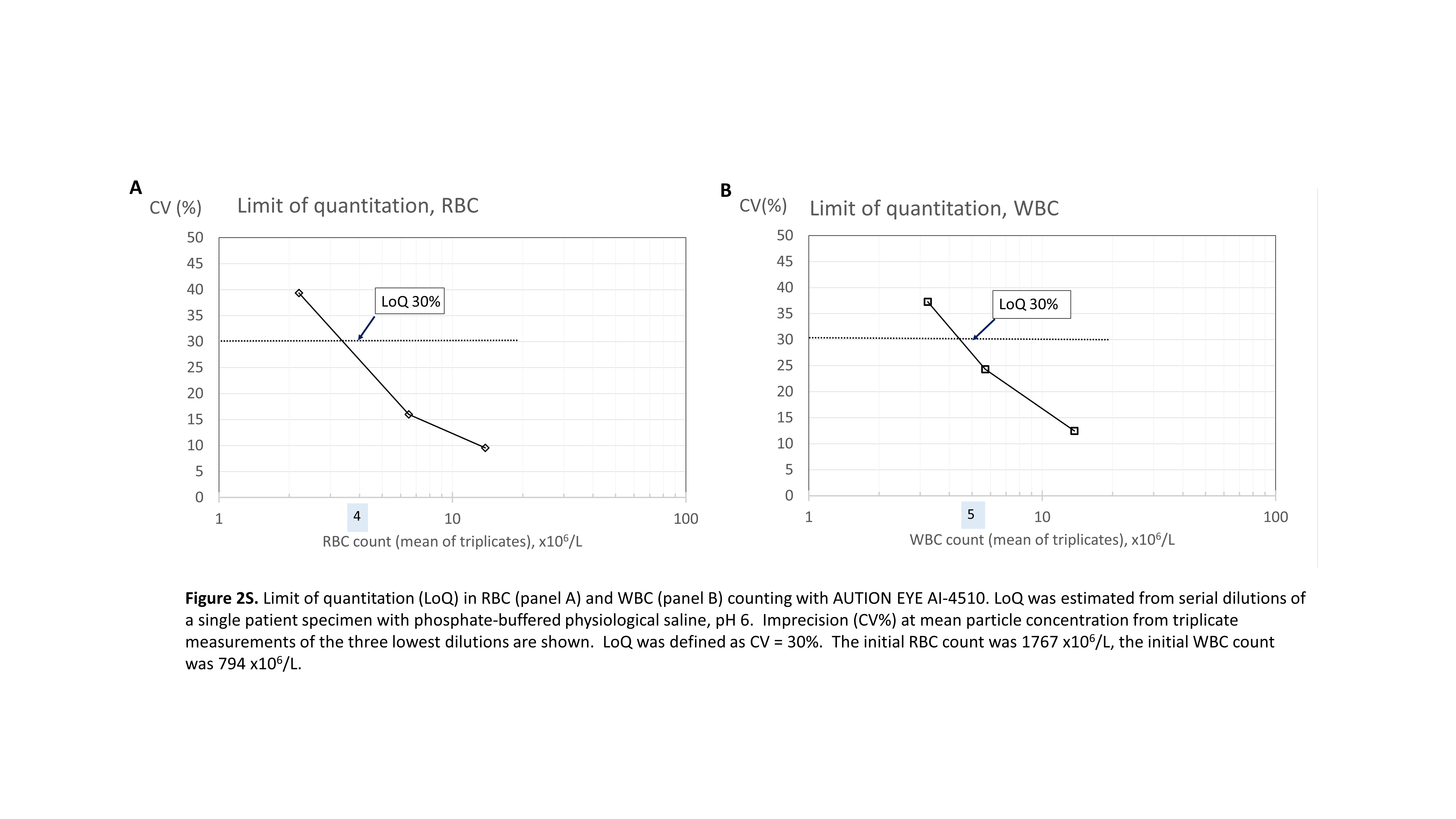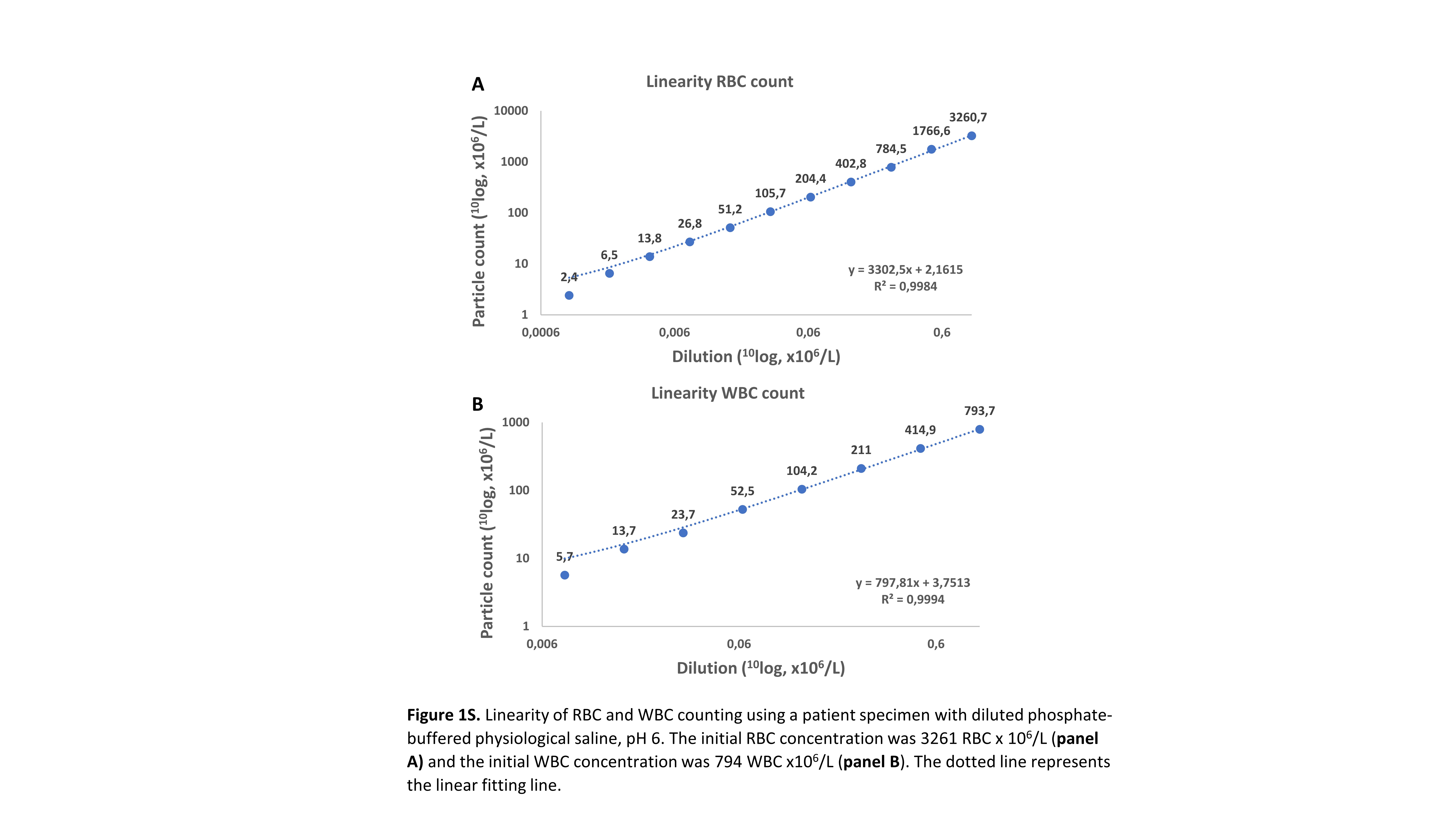 Linearity went down to 7 RBC × 106/L and 6 WBC × 106/L, respectively (Supplemental Figure 1S). The estimates of LoQ were 4 × 106/L for RBC and 5 × 106/L for WBC (Supplementary Figure 2S). The carry-over was negligible with 0.12 % for RBC, 0.01 % for WBC and 0.08 % for bacteria counts.