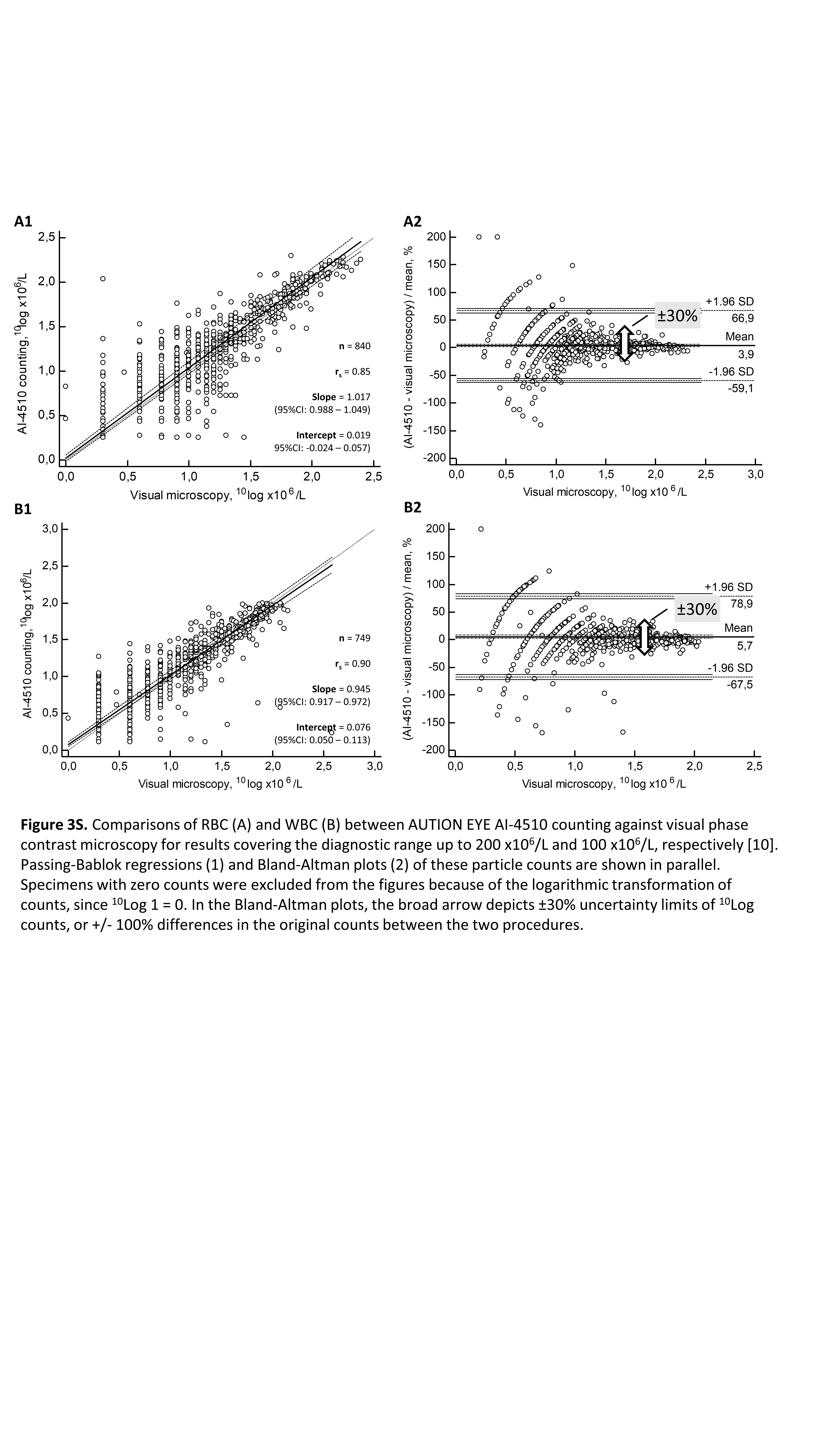 The accuracy of particle counts with the AUTION EYE AI-4510 was estimated by Bland–Altman plots as compared to visual microscopy. The mean bias of RBC counts was 3.1 % against visual microscopy (Figure 2). A similar bias of 3.9 % was seen within the 1–200 RBC × 106/L (Supplementary Figure 3S, A2). The maximum allowable analytical uncertainty between the two counts of urine particles was chosen to be ±100 % difference between the results [15]. This range arbitrarily corresponds to ±2 standard uncertainties (u) of a modelled Gaussian distribution. After logarithmic transformation, a difference of ±30 % (±0.30) in 10Log counts corresponds to the ±100 % difference in the actual counts, since 10Log 2=0.30=30 %. The maximum uncertainty between the two methods was reduced to the limit of ±30 % at 1.8 10Log RBC × 106/L, corresponding to ±100 % at 63 RBC × 106/L (Figure 2).