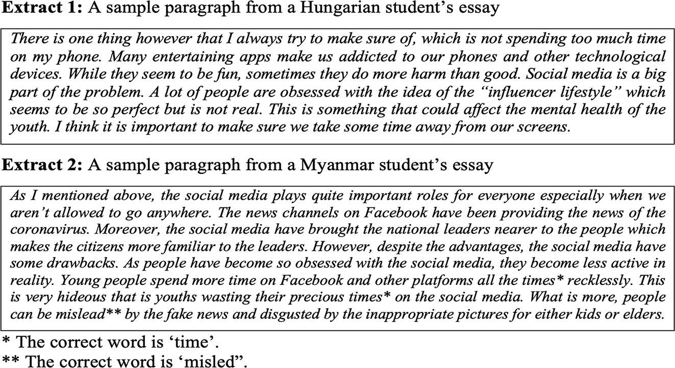 Two classes of first-year undergraduate English majors: 30 students (19 females and 11 males) from a Myanmar university and 28 students (15 females and 13 males) from a Hungarian university were recruited in the first and second semester of 2020/2021 Academic Year. The Myanmar students were native speakers of Burmese and those from the other sample were Hungarian native speakers. They were of typical university age, ranging from 17 to 18 years (Myanmar) and from 18 to 19 years (Hungary). The students’ English proficiency level was defined by the programme level. At the time of the study, both groups were enrolled in university undergraduate studies which required them to have intermediate (B1–B2) levels according to the CEFR (Common European Framework of Reference for Languages) scale. The students voluntarily participated and were informed that their written texts were anonymously analyzed for research purposes.