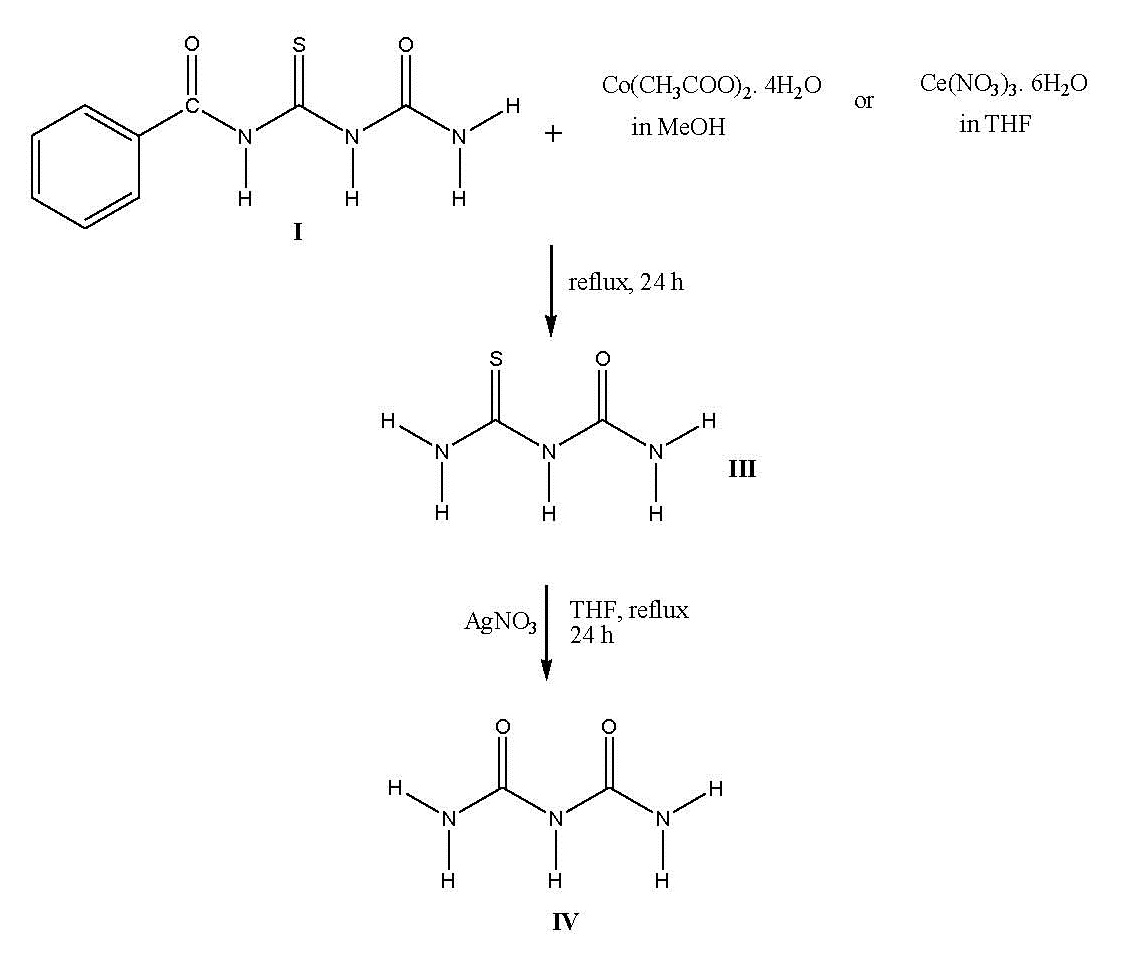 The cobalt acetate mediated cleavage of compound I in THF gave a benzamide (V) as the only isolable product (Scheme 7). The reaction of cobalt acetate tetrahydrate with benzoyl iosthiocyanate derivatives yielded a benzamide (V) as one of the side products regardless of the initial material. This reaction was confirmed using three different benzoyl isothiocyanate derivatives. But with methanol as a solvent, (carbamoylamino) methanethioamide (III) was obtained. Cobalt cleaves benzamide from 1-((benzamido) sulfanylenemethyl)urea (I) in a non-specific way resulting in a mixture of products. But cobalt acetate tetrahydrate in methanol yields (carbamoylamino) methanethioamide and possibly benzoic acid. Scheme 6 gives the synthesis scheme for the synthesis of compounds III and IV with the last step being the silver reaction. The IR spectrum of compound IV, dicarbamolyamine, showed bands at 3377, 3334 and 3234 cm–1 for the N–H interval, and a band was observed at 1654 cm–1 for the C=O interval. The 1H NMR spectrum of compound IV showed single resonances for protons at 10.20, 9.87, 9.74 and 9.49 ppm due to the amine protons. To our knowledge, this is the first presentation of dicarbamolyamine in the literature, the closest derivatives being diacyl ureas which were recently published by Hernandez et al. [29].