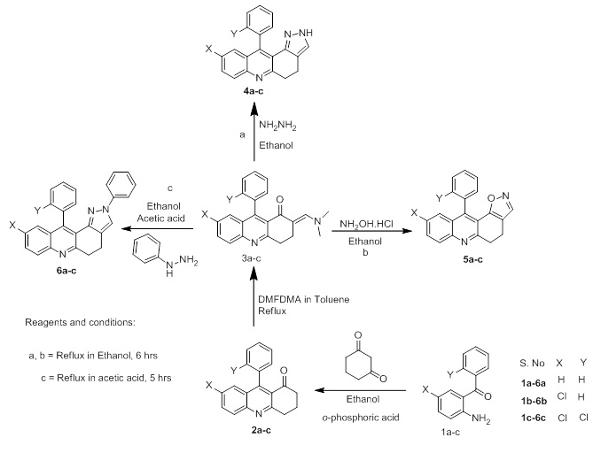N, N-Dimethylformamide dimethyl acetal (DMFDMA) also known as 1, 1-dimethoxy-N, N-dimethylmethylamine or 1, 1-dimethoxytrimethylamine, as its name indicates, is a derivative of formamide [1] acts as methylating and formylating agent. Formylated products obtained by treating compounds with active methylene group and DMFDMA have proved to be very useful intermediates in the synthesis of heterocycles [1, 2, 3, 4]. Enaminone derivatives have been proven to be valuable synthon for the synthesis of a wide variety of biologically active heterocycles [4]. On the other hand, the functionalized acridines are often used to design and synthesize the compounds with various pharmacological activities such as antibacterial [5], antifungal [5], anti-inflammatory [6], anticancer [7], anti-cytotoxic [8] and anti-malarial activities [9]. Though the synthesis of enaminone and its derivatives from simple ketones using DMFDMA are available in the literature, only a very few reports are available on the enaminones from active methylene of the various heterocycles [1, 2, 3, 4 and 10, 11, 12, 13, 14]. This prompted us to attempt the present work in which we have used the active methylene group of 3,4-dihydro-9-arylacridin-1(2H)-ones to synthesize the corresponding enaminone which in turn used as a synthon to obtain the corresponding pyrazole, isoxazole and 1-aryl-1H-pyrazole using hydrazine, hydroxylamine, phenylhydrazine respectively.