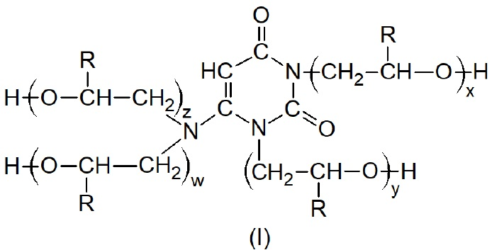 Oligoetherols with a 1,3-pyrimidine ring were previously obtained [3] also in a reaction of AU with EC, and next with PO. The first stage was carried out for 18.5-22 hrs at a temperature of 140°C and with potassium carbonate as a catalyst, while the second stage - in the pressure reactor at a temperature of 70°C, with TEA for 12.5-38 hrs [3].