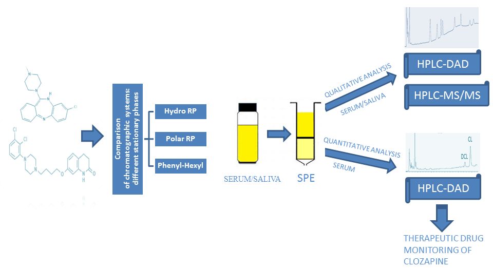 The various chromatographic systems have been applied for the separation and analysis of various combinations of selected drugs and their metabolites in the serum and saliva samples obtained from psychiatric patients using the HPLC-DAD and LC-MS/MS methods. The optimal SPE procedure and chromatographic system was chosen for the determination of clozapine, aripiprazole and their active metabolites in human serum and saliva samples by HPLC-DAD. Optimal conditions for sample preparation and LC-MS/MS analysis was also applied for determination of clozapine and its active metabolite N-desmethylclozapine in the serum collected from patients treated with clozapine and aripiprazole for therapeutic drug monitoring.