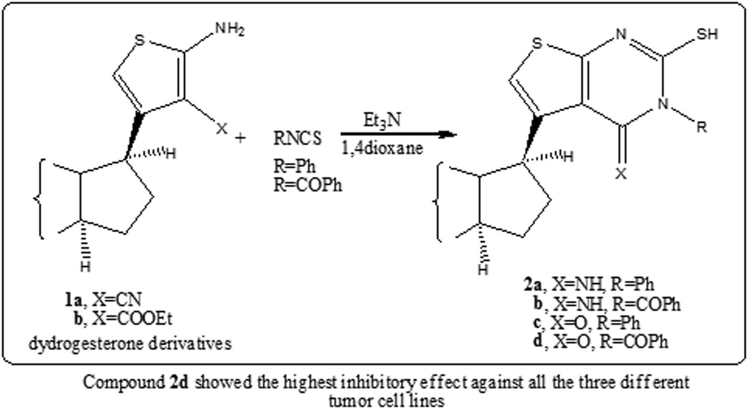 On the basis of our consideration to design and to develop antitumor activities of heterocyclic compound derivatives, especially in fused ring system, we refer to the possibility of the heterocyclic extension of one of the most important steroid compounds used as a medicinal drug. The reaction of dydrogesterone with each of the malononitrile or ethylcyanoacetate containing elemental sulfur afforded thiophene derivatives 1a,b. Also, dydrogesterone was reacted with a mixture of ethylcyanoacetate–hydrazine, ethylcyanoacetae–urea, or ethylcyanoacetate–thiourea to produce pyrazole derivative 4 and pyrimidine derivatives 5a,b. Thienopyrimidine derivatives 2a–d were introduced from the reaction of thiophene derivatives 1a,b with either phenylisothiocyanate or benzoylisothioyanate. Furthermore, compounds 1a,b were directed toward the reaction with ethylcyanoacetate to produce compounds 6a,b, and the last compounds 6a,b were directed toward cyclization to obtain thienopyridine derivatives 7a,b. In addition, compounds 6a,b were subjected to react with different carbonyl compounds, such as salicylaldehyde, cyclopentanone-elemental sulfur, malonaldehyde, and acetylacetone to produce coumarin derivatives 8a,b, fused thiophene derivatives 9a,b, and pyridine derivatives 10a–d. Isooxazole derivatives 12a,b were afforded through the reaction of compounds 6a,b with hydroxylamine hydrochloride. Finally, 2-pyridone derivatives 14a,b were obtained through the reaction of compounds 6a,b with benzoylacetonitrile. Conformation structure of the synthesized compounds was established by applying IR, 1H NMR, 13C NMR, and mass spectrometry, and their antitumor activity was examined. Some compounds showed promising growth inhibitory effects on the three different cell lines.