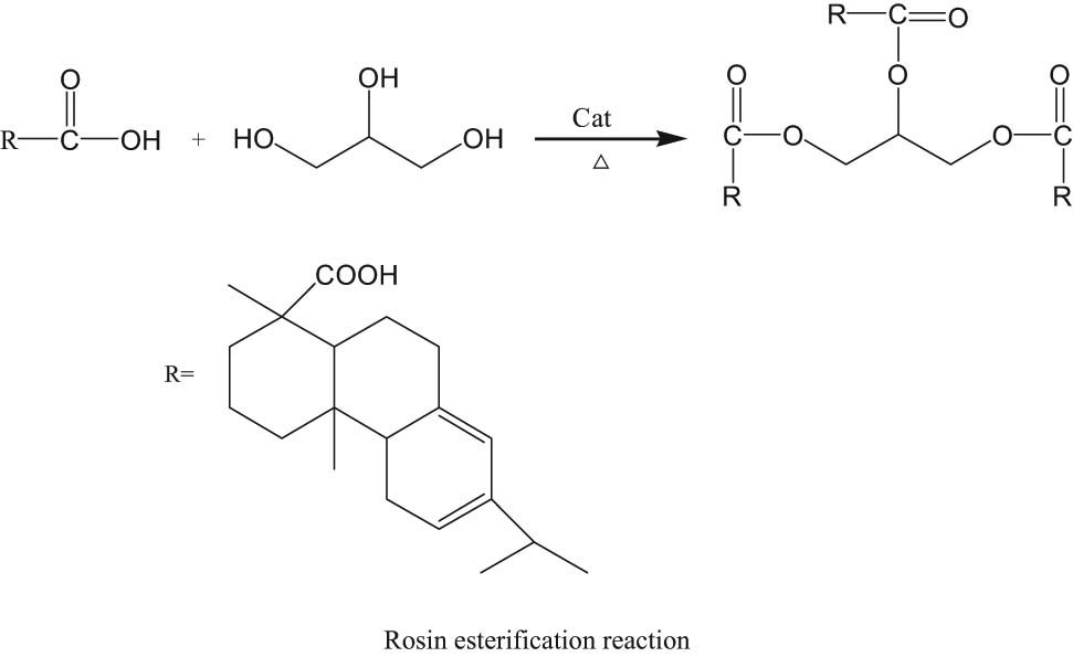 Rosin, ethylene glycol, and catalyst were added to a three-necked flask equipped with a thermometer and a water condenser with a spherical condensation. The reaction temperature was 240–280°C and the reaction time was 5 h. According to GB/T8146-2003 “Rosin Test Method” [15] and GB10287-2012 “Food Additives: Rosin Glyceride and Hydrogenated Rosin Glyceride” [16], the acid value of the product after cooling was measured.