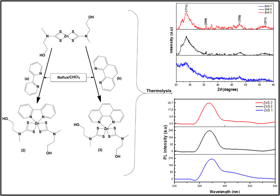 Herein, we present the synthesis, structural and optical properties of ZnS nanoparticles derived from Zn(ii) bis(N-methyl-N-ethanoldithiocarbamate) (1) and its 2,2′-bipyridine (2) and 1,10′-phenanthrolin (3) adducts.
