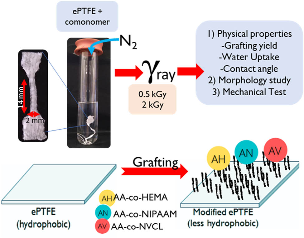AA, HEMA, NIPAAM, and NVCL were all obtained from Sigma-Aldrich. The comonomers used were a mixture of comonomer AA and HEMA, AA and NIPAAM, and AA and NVCL, and the samples were labeled as AH, AN, and AV, respectively. In this study, the ePTFE used is from the Pall Corporation and has a thickness of 0.3 mm, different from the 0.22 mm-thick ePTFE used in our previous study [15]. The total concentration of comonomer used is 1 M.