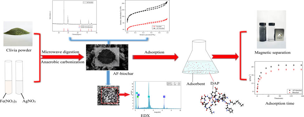 Previously, our research group used two magnetic ultra-fine wood-based biochars for the adsorption and magnetic separation of DAP [24]. On this basis, AgNO3 and Fe(NO3)3 were loaded onto clivia leaves by microwave digestions to obtain magnetically separable biochar. Then unmodified biochar (Biochar) was used as blank control to analyze the adsorption mechanism of modified biochar (AF-biochar), with element composition, structure, surface morphology, functional groups, and magnetic properties of characterized biochar. The pH, contact time, initial DAP concentrations, and temperatures of solutions were experimentally studied. Moreover, the adsorption mechanism was described by the adsorption isotherm, kinetic model, and thermodynamics. The retrievability of biochar was studied by five repeated experiments.