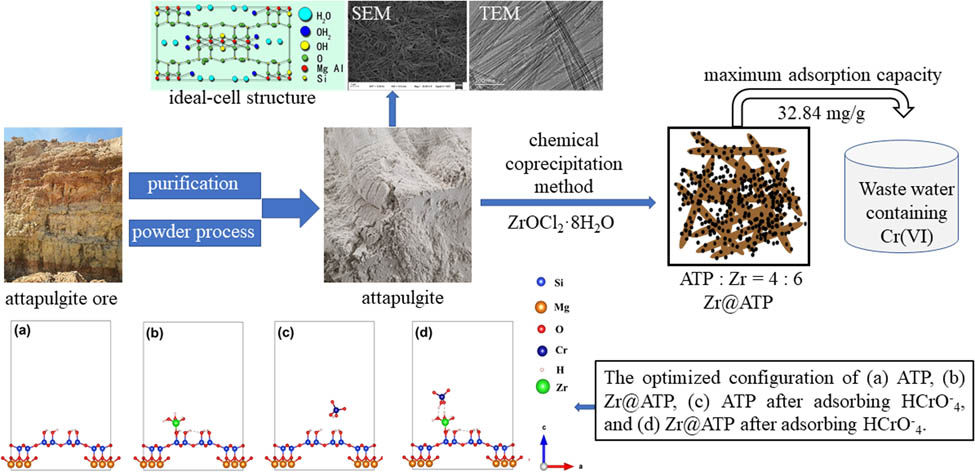 Fortunately, extensive treatment technologies such as photocatalytic degradation, membrane filtration, adsorption, and ion exchange methods have been explored for eliminating Cr(vi) from the water bodies [9,13,14]. As an economic and well-established technology, adsorption is extensively utilized for sewage treatment. The current research on adsorbing agents primarily concentrates on metal-organic frameworks, natural or modified clay materials/biochar, and activated carbon [15–18]. As a natural one-dimensional nanomaterial, attapulgite (ATP) has been widely used in many fields since its discovery. Such a wide acceptance of the material can be attributed to its excellent physical and chemical properties [12,19–21]. Due to the presence of impurities, high surface energy, self-aggregation, and other issues, the adsorption capacity of natural raw attapulgite is low [22]. Therefore, ways to improve the adsorption performance of natural attapulgite through modification, compounding, and other methods are also the current research focus in this field. Moreover, the mechanism of Cr(vi) adsorption have not revealed from energetic and atomic perspectives. Density functional theory (DFT) calculation is utilized as an effective approach to study the adsorption process of HM ions [23–25].
