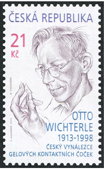 The Czech stamp illustrated here was issued in 2013 to commemorate the centennial of Wichterle’s birth. In addition to his pioneering work on hydrogels, he studied the polymerization of ε-caprolactam to produce Nylon 6 and investigated the conversion of vinylic halides such as 1,3-dichloro-2-butene to ketones (a variation of the Robinson annulation that now bears his name). He published more than 150 scientific articles and obtained approximately 180 patents for his multiple contributions to chemistry and materials science. In 1967, he became the founder and first president of IUPAC’s Macromolecular Division, which became the Polymer Division (“Division IV”) in 2004. Shortly after democracy was restored in his homeland at the end of 1989, he was elected President of the Czechoslovak Academy of Sciences, a belated honor for a man who served his country in both the political and scientific arenas. Interestingly, even though Wichterle is universally considered the father of soft contact lenses, he never stopped wearing his own pair of eyeglasses!