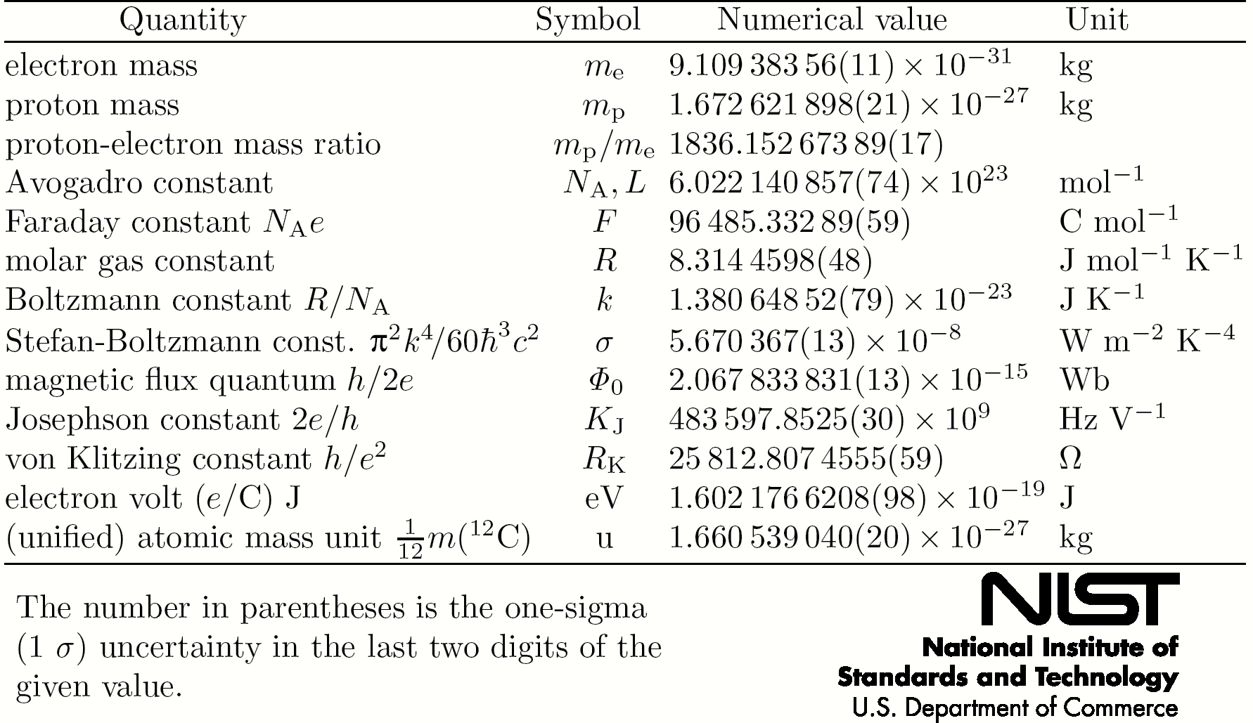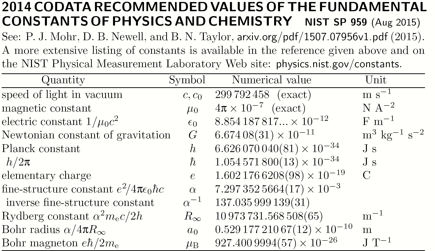 The full scholarly paper providing the 2014 self-consistent set of values of the constants and conversion factors of physics and chemistry recommended by the Committee on Data for Science and Technology (CODATA) was published in September 2016 in Review of Modern Physics 88, 035009 (2016); https://doi.org/10.1103/RevModPhys.88.035009 . The full text article, a wall chart, and a wallet card (reprint below) are available from the NIST website at http://physics.nist.gov/cuu/Constants