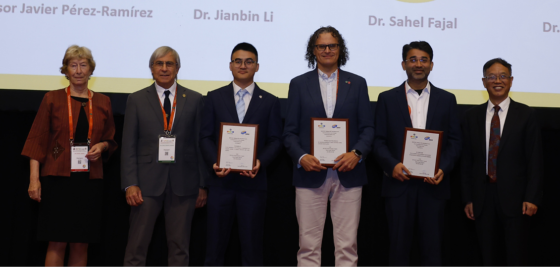 Next was the IUPAC–Zhejiang NHU International Award for Advancements in Green Chemistry. Announced at the ceremony, the Experienced Chemist award went to Javier Pérez Ramírez (ETH Zurich). Simultaneously, the Young Chemist awards were presented to Jianbin Li (Chinese University of Hong Kong), Sahel Fajal (Indian Institute of Science Education and Research), and to Philip Stanley (Technical University of Munich). Recipients were honored on stage by IUPAC President Ehud Keinan and Li Haoran of NHU.