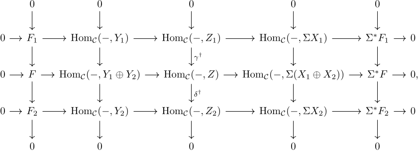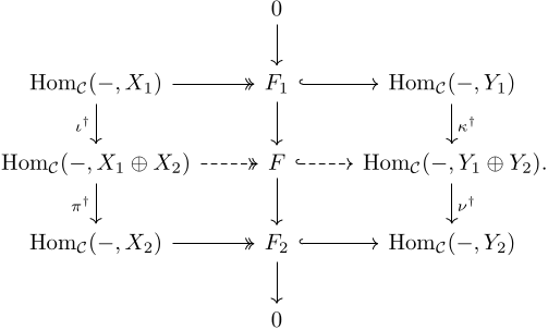 The prototype of a locally coherent category is the category Mod C of all additive contravariant functors from a skeletally small abelian or triangulated category 𝒞 to the category of abelian groups. Morphisms in Mod C are natural transformations between additive contravariant functors, and a sequence of functors is a short exact sequence if and only if evaluating on each object of 𝒞 yields a short exact sequence in the category of abelian groups. We shall denote the category fp ( Mod C ) simply by mod C . The objects in mod C are exactly the functors which occur as cokernels of morphisms between representable functors, i.e. between functors naturally isomorphic to Hom C ( , X ) : C op Ab for some 𝑋 in 𝒞. The direct factors of representables are the finitely presented projective objects in Mod C . Let 𝐻 be an object in Mod C , and consider an object 𝑋 in 𝒞. By identifying Hom Mod C ( Hom C ( , X ) , H ) with H ( X ) via the Yoneda lemma, H ( X ) becomes a left module over the ring End Mod C ( H ) .