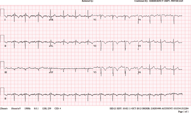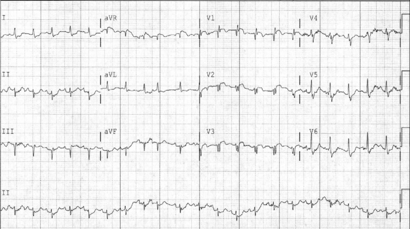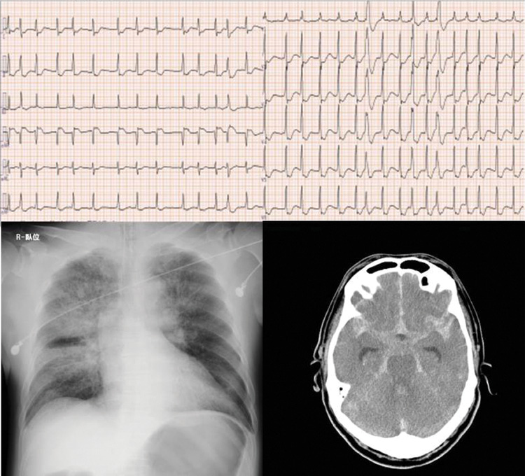 Laboratory data were not contributory except for positive blood troponin level. A 12-lead ECG showed atrial fibrillation, right bundle branch block and ST depression in lead V1-6. Chest X-ray showed lung congestion compatible with heart failure. Echocardiography showed left ventricular (LV) diffuse severe hypokinesia (ejection fraction, about 20%). Acute coronary syndrome was suspected and cardiology team was called. However, general internist examined him and ordered brain CT, showing severe subarachnoid hemorrhage (SAH). Neurosurgeon was called but only comfort care was recommended for SAH and he died after several hours after the admission.