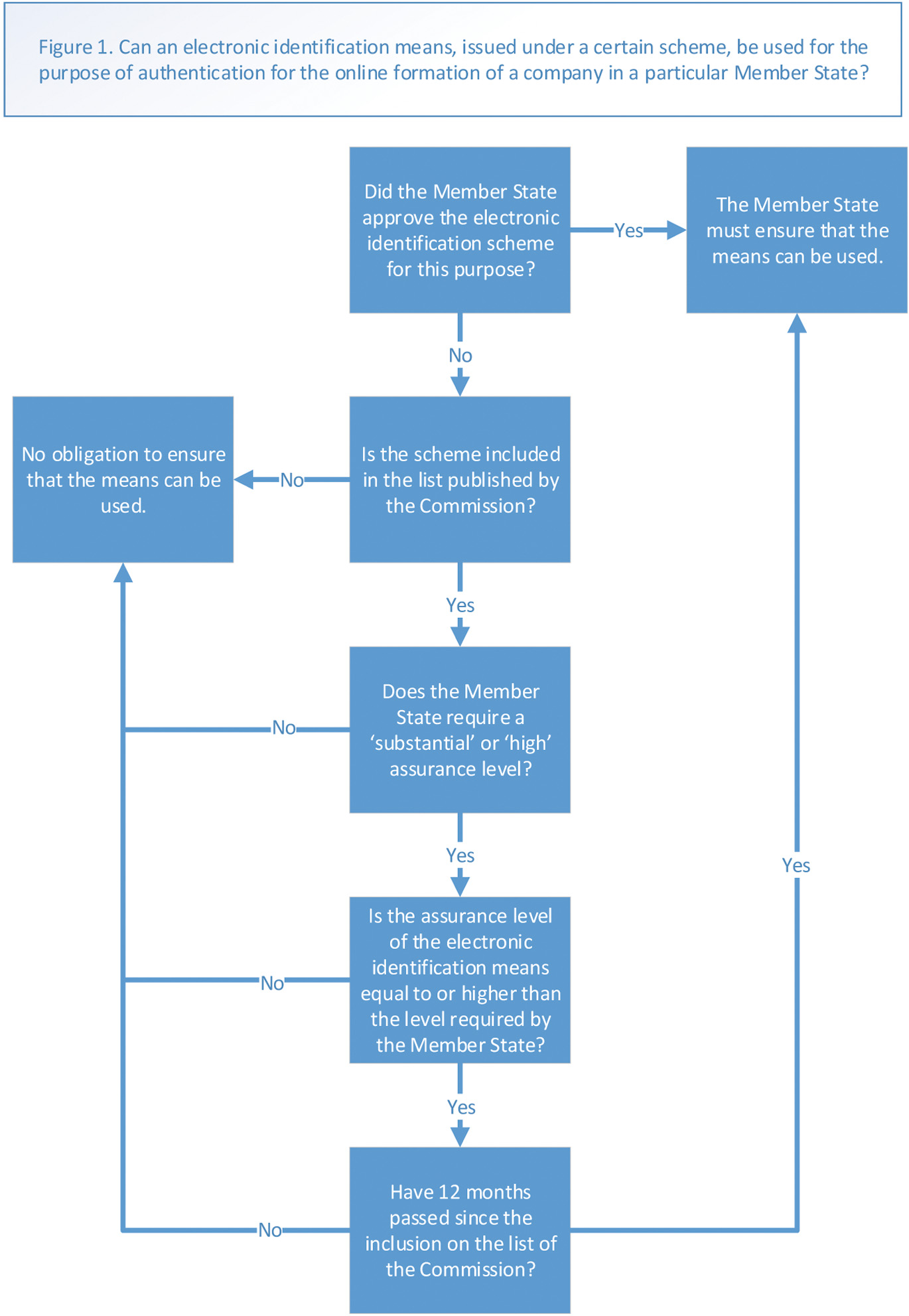 The obligation to recognise electronic identification means also depends on the assurance level required by the Member State.[128] The ‘foreign’ means must 90achieve the same level as the means approved by the Member State. Furthermore, an obligation to recognise only exists if the required assurance level is ‘substantial’ or ‘high’.[129] A Member State is never required to recognise means that have a ‘low’ assurance level,[130] even if the approved natural scheme also only guarantee a ‘low’ assurance level. This means that a Member State could theoretically frustrate the cross-border online formation of companies by citizens from other Member States by only approving an electronic identification scheme with a ‘low’ assurance level that (in practice or de jure) is only available to its own citizens. Figure 1 provides a chart to determine whether an electronic identification means can be used in a certain country.91