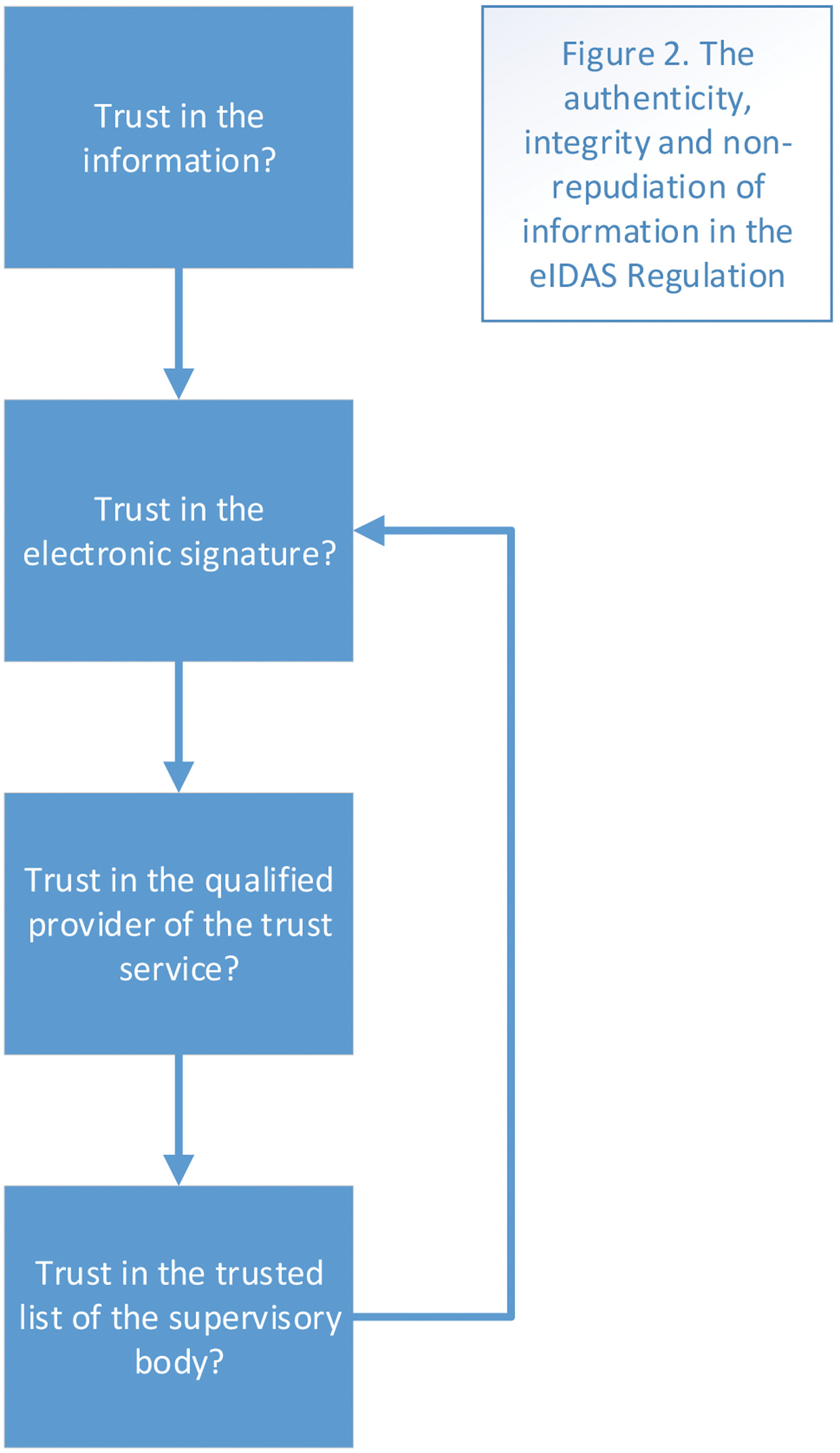 Qualified electronic signatures offer the most certainty. The eIDAS Regulation formulates more stringent requirements for these signatures than for ‘normal’ or ‘advanced’ electronic signatures.[155] They are also subject to more supervision. They may only be offered by providers of trust services who have received the ‘qualified’ status from the national supervisory body of the Member State where they are established.[156] Furthermore, the Member States must establish, maintain, and publish ‘trusted lists’ pursuant to Art. 22(1) of the eIDAS Regulation. These lists contain information on the qualified providers for which they are responsible. The European Commission publishes an overview of the various lists.[157] The trusted lists enable the register and other parties to verify whether a specific trust service provider is ‘qualified’. Under Art. 22(2) of the eIDAS Regulation, the trustworthiness of these lists is guaranteed by an electronic signature. Figure 2 gives an overview of the way electronic signatures and the system of the eIDAS regulation can achieve the authenticity, integrity, and non-repudiation of electronic information.