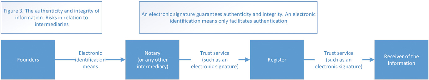 This leads to new risks. In theory, the information provided by the founders to the notary could be altered before it is entered into the register. As discussed in Section VI.2.a, the prescribed electronic identification means do not guarantee authenticity and integrity. Even if the notary uses an advanced or qualified electronic signature, the information provided by the founders to the notary could still be altered before it is entered into the register or included in the notarial deed. Figure 3 gives an overview of this issue.