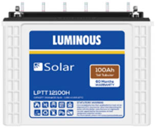 Model type LPTT 12100H, warranty 5 years, rated capacity 100 A h, inverter support 10KYA-900 VA, nominal voltage 12 V, tall tubular technology, depth of discharge 80%