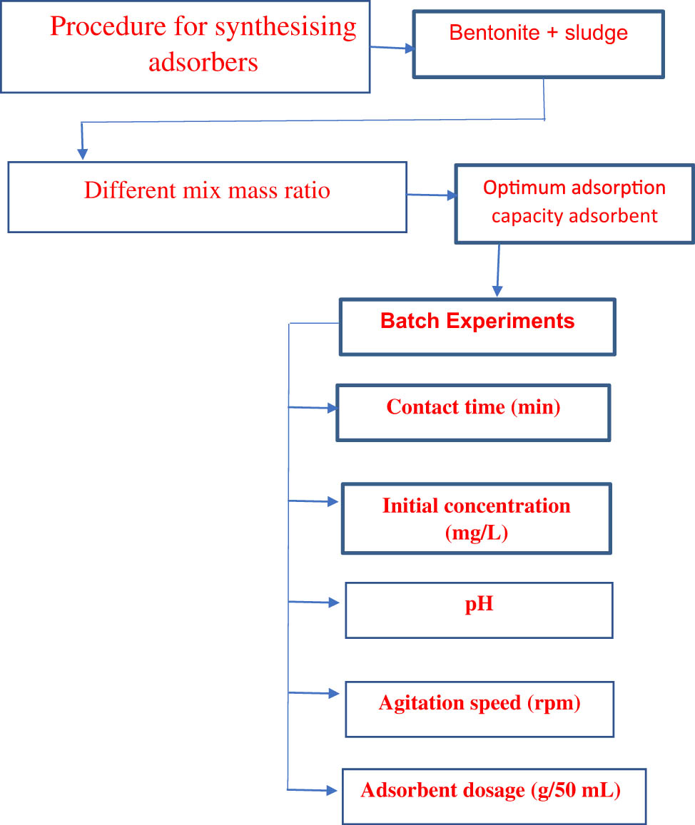 The newly created adsorbent composites underwent physical activation to prepare them. The materials are ground, sludge and bentonite SB composite formed as bentonite is progressively added to the water, and then sludge is added with the addition of water. The materials are then dried in a drying oven for 12 h at a temperature of 105.5°C. For 30 min, the solution is stirred with a magnetic stirrer. The solution is then filtered. The filter is burned in the oven for 2 h at 800°C using filter sheets. Grinding with a grinder is the end result. The mass ratios of bentonite and sludge at 4:1, 3:1, 2:1, 1:1, 1:2, and 1:4 [29] are shown in the flowchart below.