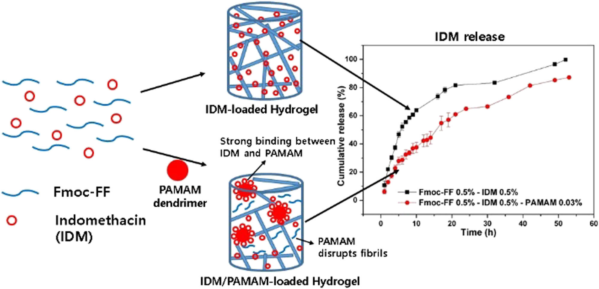 High concentrations of IDM drugs can be incorporated into hydrogels during the self-assembly of Fmoc-FF. Small amounts of PAMAM added to the hydrogel (Fmoc-FF 0.5%–IDM 0.5%–PAMAM 0.03%) resulted in more prolonged IDM release when compared with Fmoc-FF 0.5%–IDM 0.5% hydrogel.