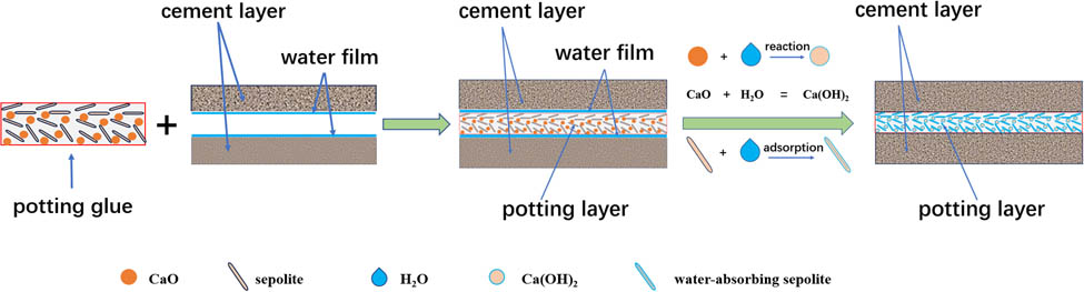 Moist cement tends to generate a minute water film at the interface. When regular potting adhesives come into contact with this water film, the silane crosslinking agents within the adhesive undergo a reaction, becoming highly hydrated and subsequently initiating self-polymerization and condensation reactions to form siloxane bridges (12). This reaction leads to a substantial depletion of the silane crosslinking agent, which is detrimental to the silicone rubber’s crosslinking reaction. In our research, we developed a moisture-resistant potting adhesive by blending SEP, known for its potent water-absorbing capabilities, and calcium oxide, which vigorously reacts with water, with silica gel to craft a single-component waterproof silicone rubber. When this moisture-resistant filling gel is injected into damp cement cracks, the surface of the SEP, rich in active hydroxyl groups, absorbs a significant amount of water (32). Simultaneously, SEP’s internal tubular channels further facilitate water absorption through capillary action. Additionally, the reaction between calcium oxide and water generates calcium hydroxide, reducing the water content and preventing excessive water loss from the silica gel’s crosslinking agent. Furthermore, the reaction between calcium oxide and water produces heat, further catalyzing the crosslinking reaction between the crosslinking agent and silica gel. Through the physical adsorption properties of SEP and the chemical reaction involving calcium oxide and water, the adverse impact of the water film on the silica gel’s crosslinking reaction is significantly mitigated, if not completely eliminated.