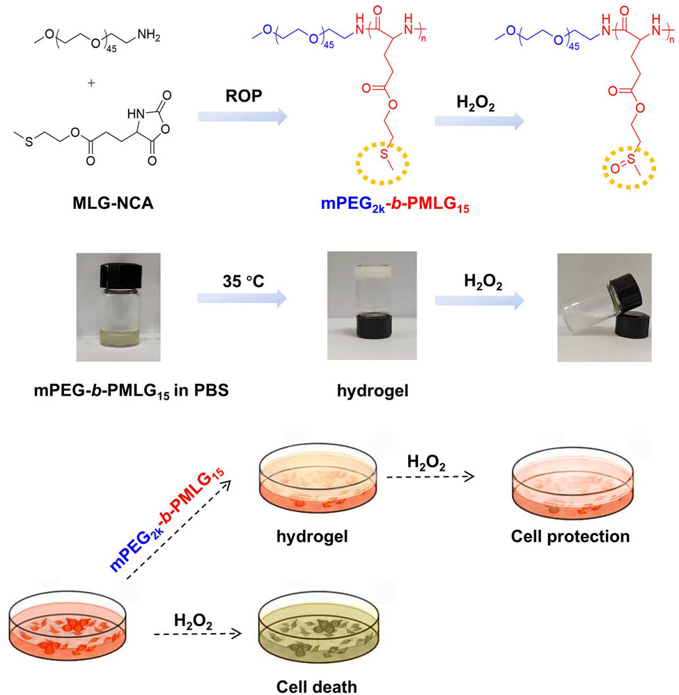 Amphiphilic block copolymers only with specific degree of polymerization of both PEG segment and polypeptide chain could form injectable ROS-responsive hydrogels, which protect normal cells from oxidative damage.