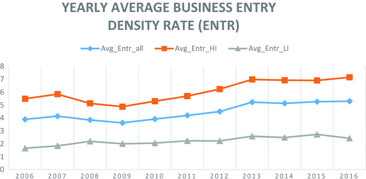 Note: Avg_Entr_all stands for the average business entry density rate for the entire sample of countries, in each year, Avg_Entr_HI stands for the average business entry density rate for the high income countries, in each year and Avg_Entr_LI stands for the average business entry density rate for the low income countries, in each year.