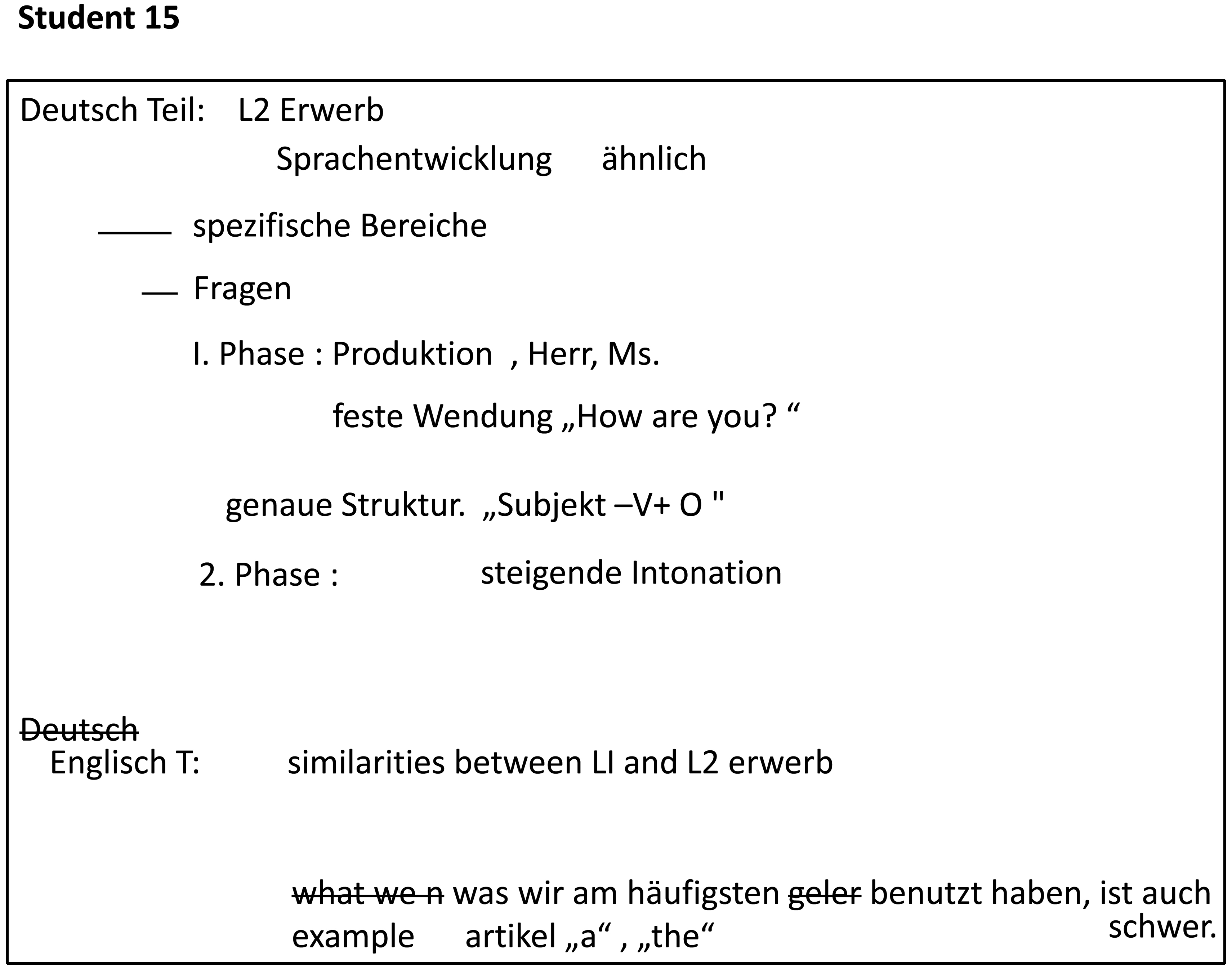 Die erste Phase beim Erwerb von Fragestrukturen ist die Produktion von Ein-Wort-Fragen mit steigender Intonation, zum Beispiel “here?” oder “this one?” oder “my money?”. Wie man sieht, muss man dabei die Definition des Begriffs “Wort” ein wenig dehnen, denn in der Zielsprache besteht die Äußerung “this one?” eigentlich aus zwei Worten. Wir wissen jedoch von der Studie von zweitsprachlichen Korpora, dass Lerner auf dieser Stufe Ausdrücke wie “this one?” als EINEN Eintrag im mentalen Lexikon speichern. Die Lernersprache enthält auf der ersten Stufe viele Ein-Wort-Einheiten dieser Art. Diese Ein-Wort-Einheiten können mit Worten der Zielsprache übereinstimmen, z. B. “where?” oder auch aus ganz festen Wendungen bestehen wie etwa “how are you?”.