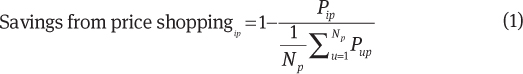 Finally, we construct a variable, “Savings from Price Shopping,” indicating the savings due to price shopping relative to costs if patients randomly chose a price from the available price points for a particular service. This outcome is defined in Equation (1):