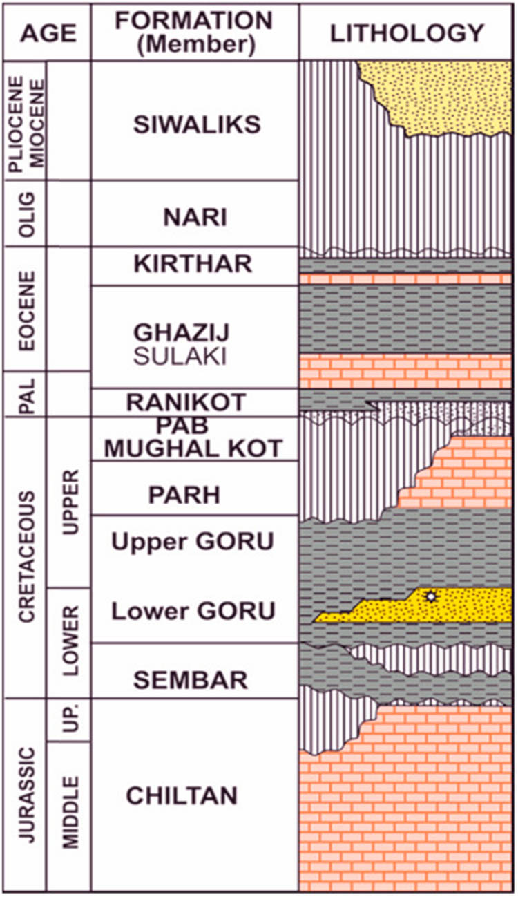 Generalized sequence stratigraphy along with main lithology encountered in the Indus Basin Pakistan [52]