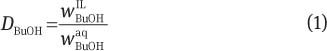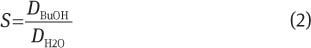 The selectivity of butanol towards water is calculated by the ratio of the butanol distribution coefficient and the water distribution coefficient [Eq. (2)].